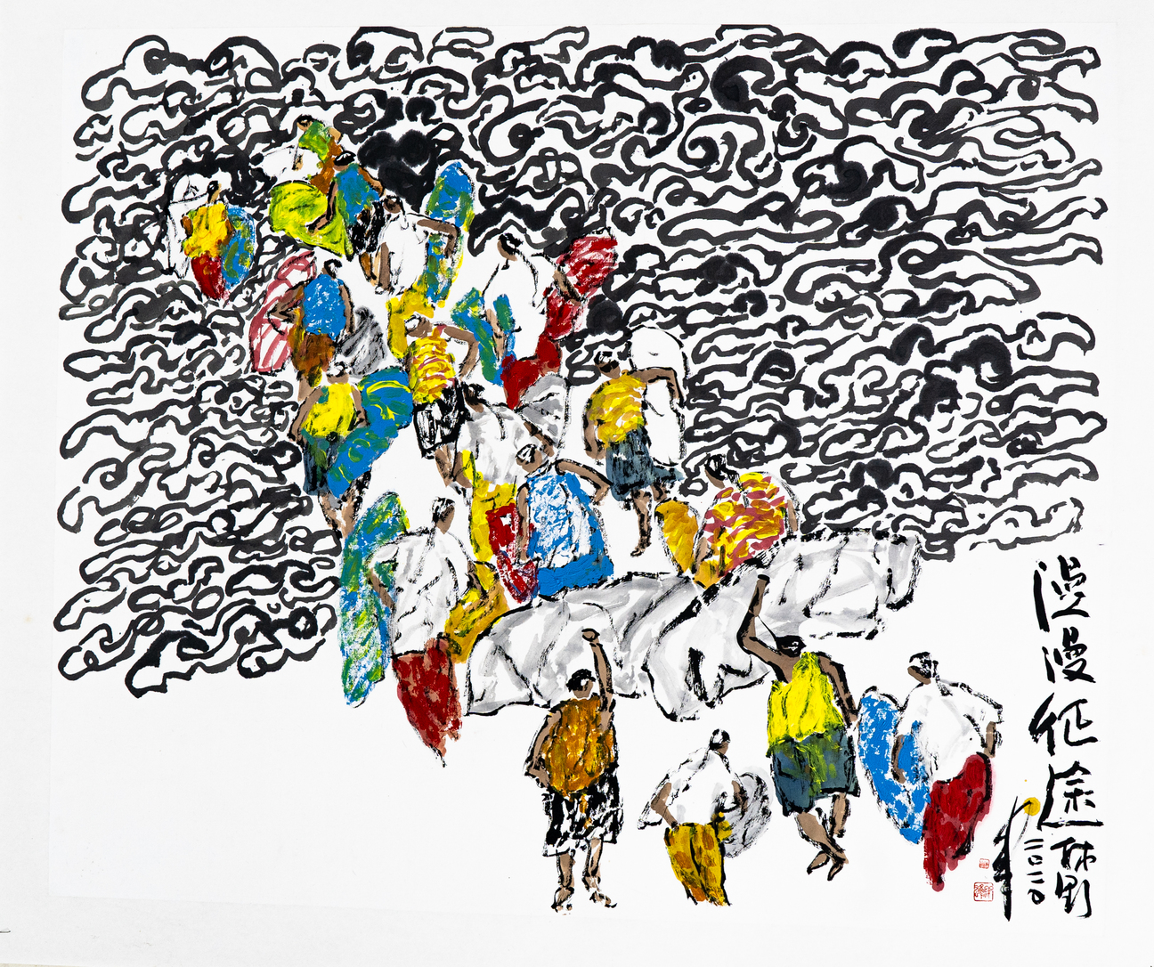 Lin’s process is physically demanding and deliberately unsettling. Ink, rice paper, wax, water and oil interact through layering and repulsion, creating surfaces that feel unstable. “Chinese traditional painting is beautiful,” he says, “but for me, beauty alone is not enough.” The tension in his works reflects their subject matter: forced migration, war, poverty, environmental collapse and the fragility of the human condition. “The discomfort you feel when looking at my work is intentional,” he adds. “I want to transmit my thinking directly to the viewer. My paintings become historical documents of society. In 50 or 100 years, they will show how we lived, suffered and thought.”