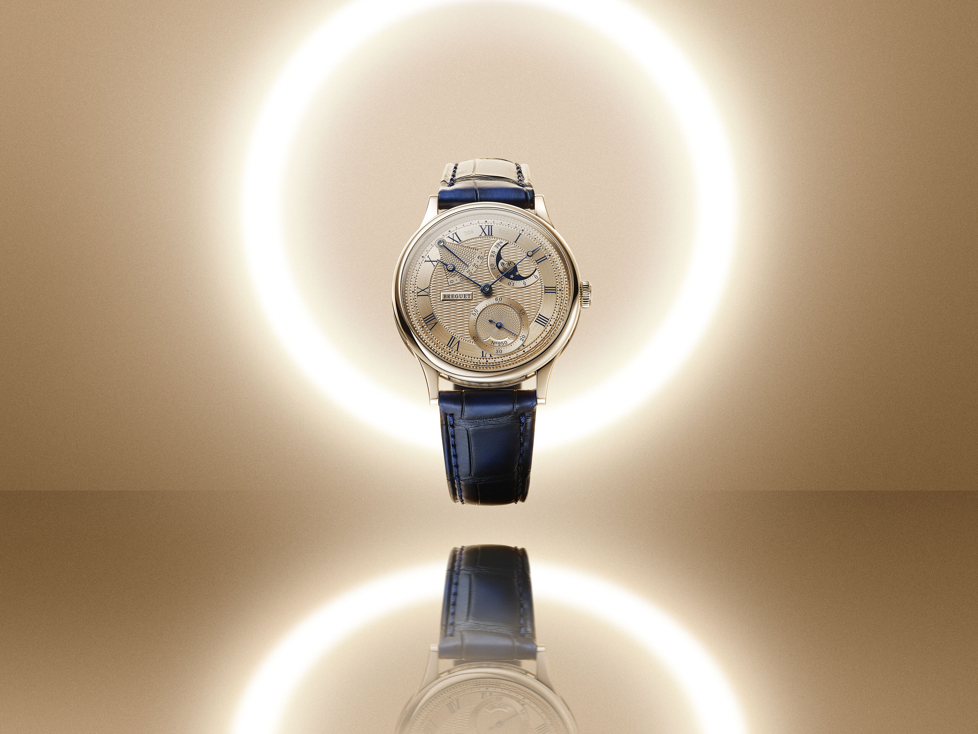 Meanwhile, complications like the moon phase at two o’clock, power reserve between ten and eleven, and small seconds at five are arranged with the balanced asymmetry that defines the Breguet aesthetic. The dial, crafted in 18K Breguet gold, features the same “Quai de l’Horloge” hand-guilloché motif, creating depth and clarity across multiple textures and levels.
