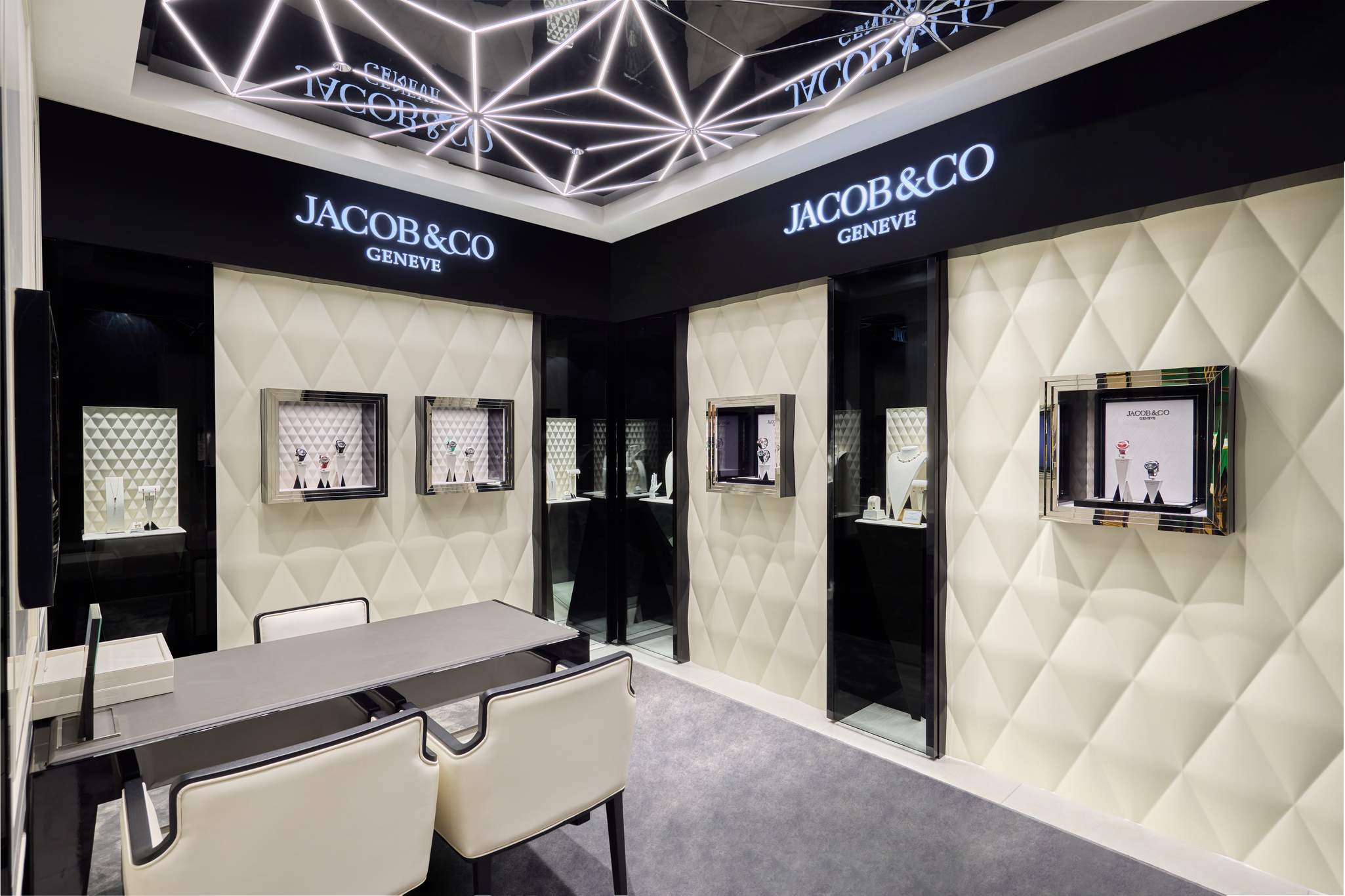 Designed as an immersive journey into the Jacob & Co. universe, the boutique blends refinement, modernity and the Maison’s unmistakable flair for spectacle. Signature star motifs adorn the high-gloss ceiling, forming a luminous cosmic canopy illuminated by integrated LED lighting. Matte white quilted panels, arranged in a diamond pattern, line the walls to echo the brilliance of the Maison’s creations, while a sculptural central tower anchors the space with a sense of sculptural drama. Throughout, timepieces and jewellery are displayed as contemporary objets d’art, framed by an expressive celebrity wall that celebrates Jacob & Co.’s global campaigns and cultural influence.