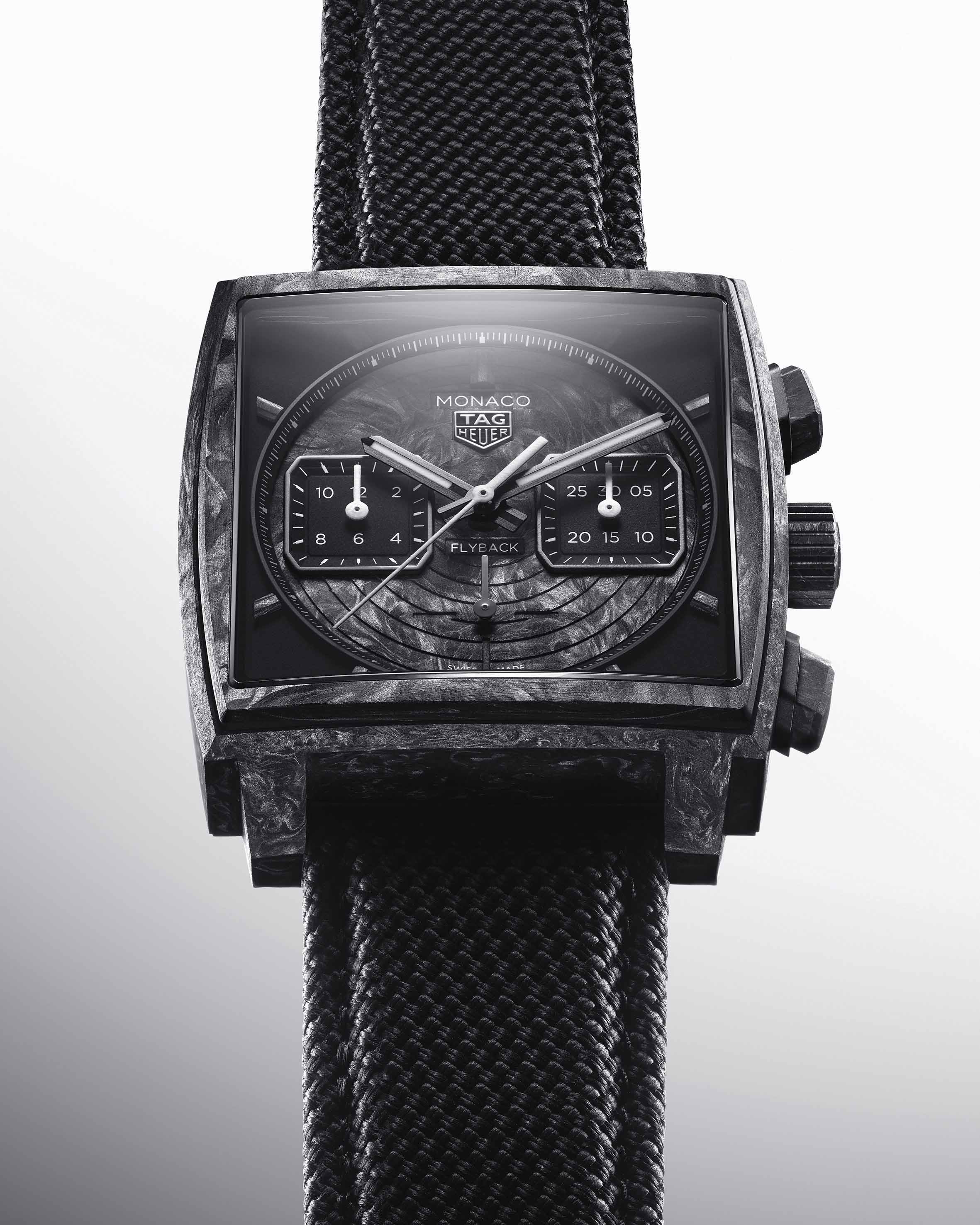 To mark the breakthrough, Tag Heuer is once again pairing its innovation with two headliners: the Monaco Flyback Chronograph TH-Carbonspring and the Carrera Chronograph Tourbillon Extreme Sport TH-Carbonspring, each limited to 50 numbered pieces. Both come clad in carbon cases, pushers, and crowns — a fitting uniform for the carbon revolution inside — and feature engraved dials with spiralling motifs that nod to the hairspring’s heartbeat. The Monaco runs on the Calibre TH20- 60 with 80 hours of power reserve, while the Carrera packs the tourbillon-equipped TH20-61 with a column wheel and 65 hours of autonomy. Unsurprisingly, both are COSC-certified.