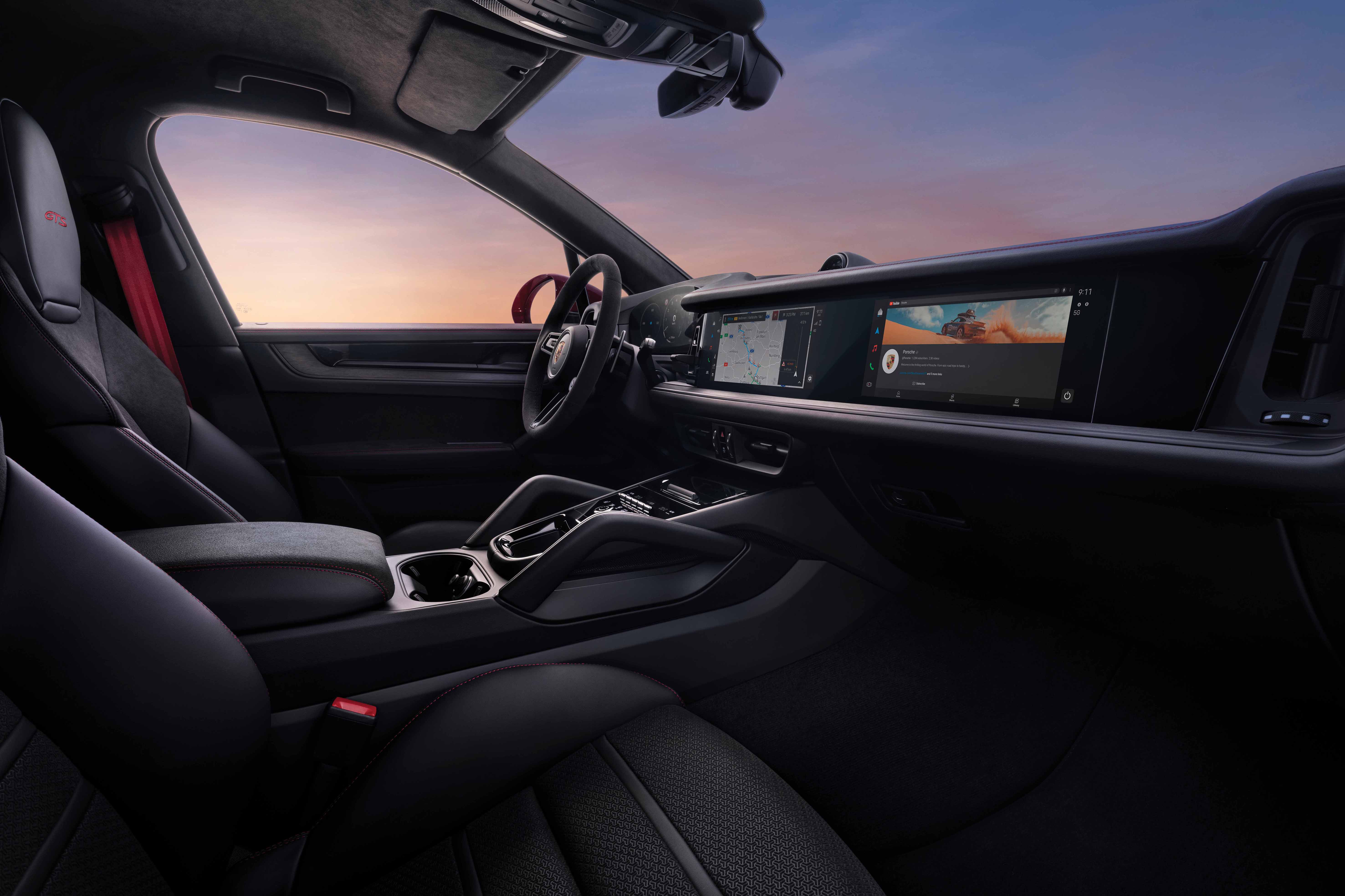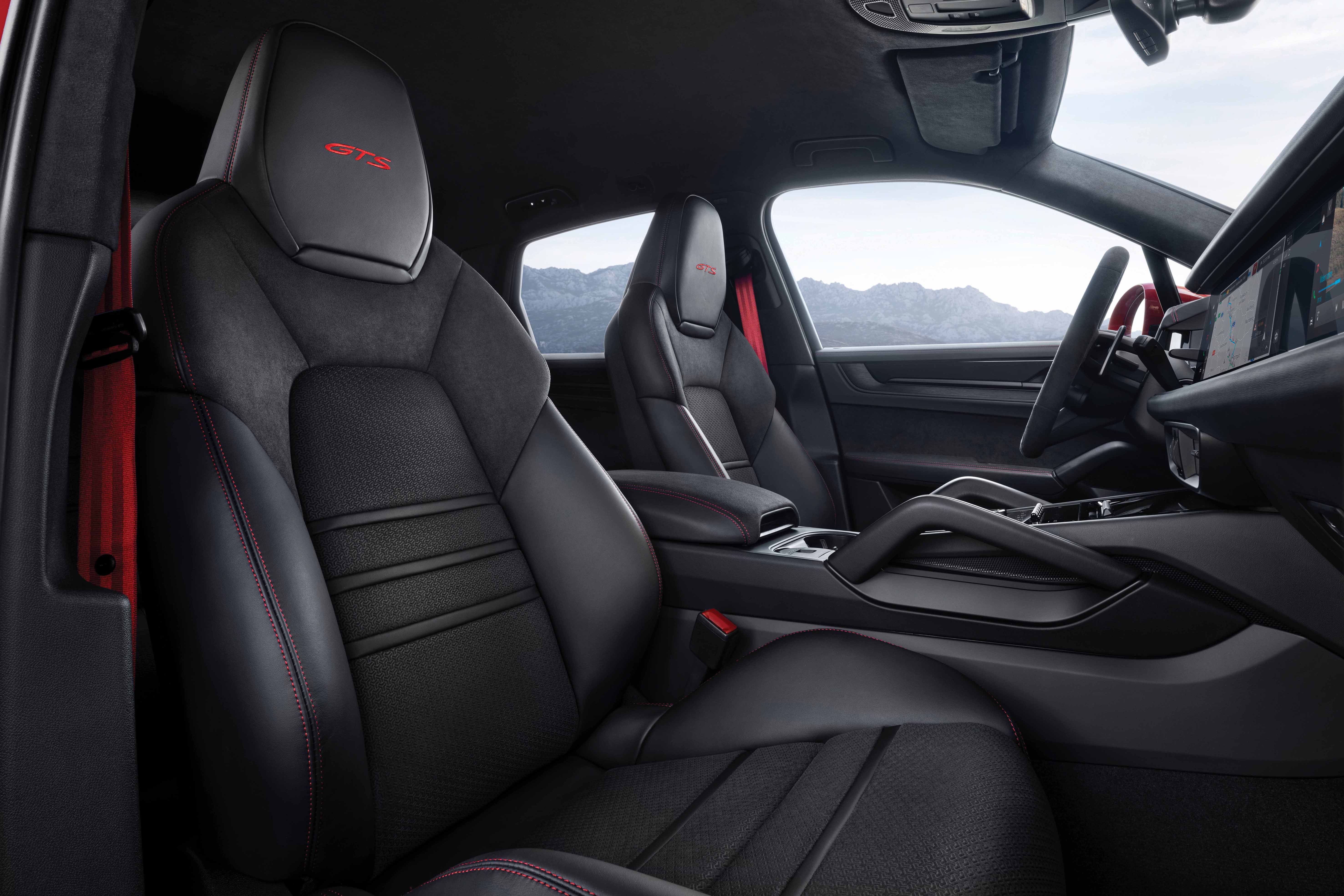 The cabin of the 2025 Cayenne GTS reflects its sporting intentions while upholding Porsche’s high standards of luxury. The interior features extensive use of Race Tex material throughout, including the roofliner, armrests, door panels, and seat centres of the 8-way sport seats. This creates a distinctly sporty atmosphere that differentiates the GTS from other Cayenne variants.