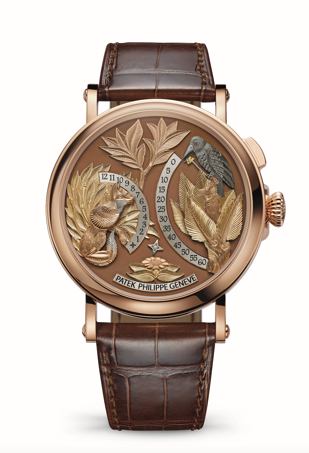 The first automaton wristwatch in the contemporary history of Patek Philippe, the Ref. 5249R-001 is a rare piece of horological theatre. Inspired by a pocket watch automaton developed by Louis Cottier in 1958, the dial springs to life with a push of the button at 2 o’clock: A fox indicates the hours with its snout or paw, while a crow drops a piece of cheese to mark the minutes. Release the pusher and the animals return to rest. Inside the 43mm rose-gold case, the 31-260 PS HMD AU calibre is hidden beneath an officer-style cover.