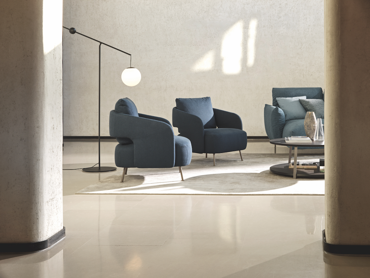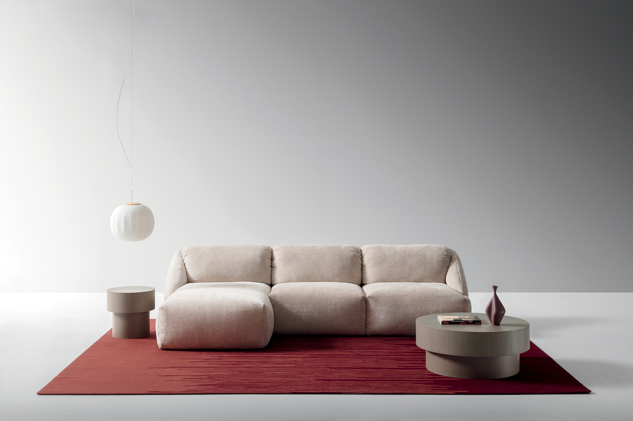 Alta elevates the very idea of comfort, translating it into a form that is soft, generous and welcoming. The volume of the sofa, inspired by a ball of cotton, is generated by the horizontal element that compresses the material and defines its form, inviting users to take the weight off their feet and relax.