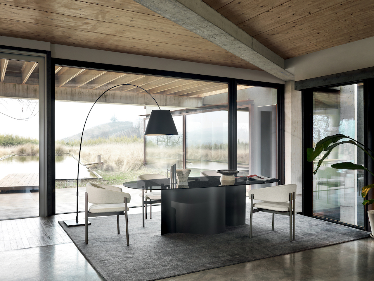 The Doon table is about the harmonious pairing of two distinct materials. The modules that form the base of the table are two identical elements in different finishes that brush up against each other. The result is a game of visual balances that changes depending on your point of view, generating new and ever-evolving forms.