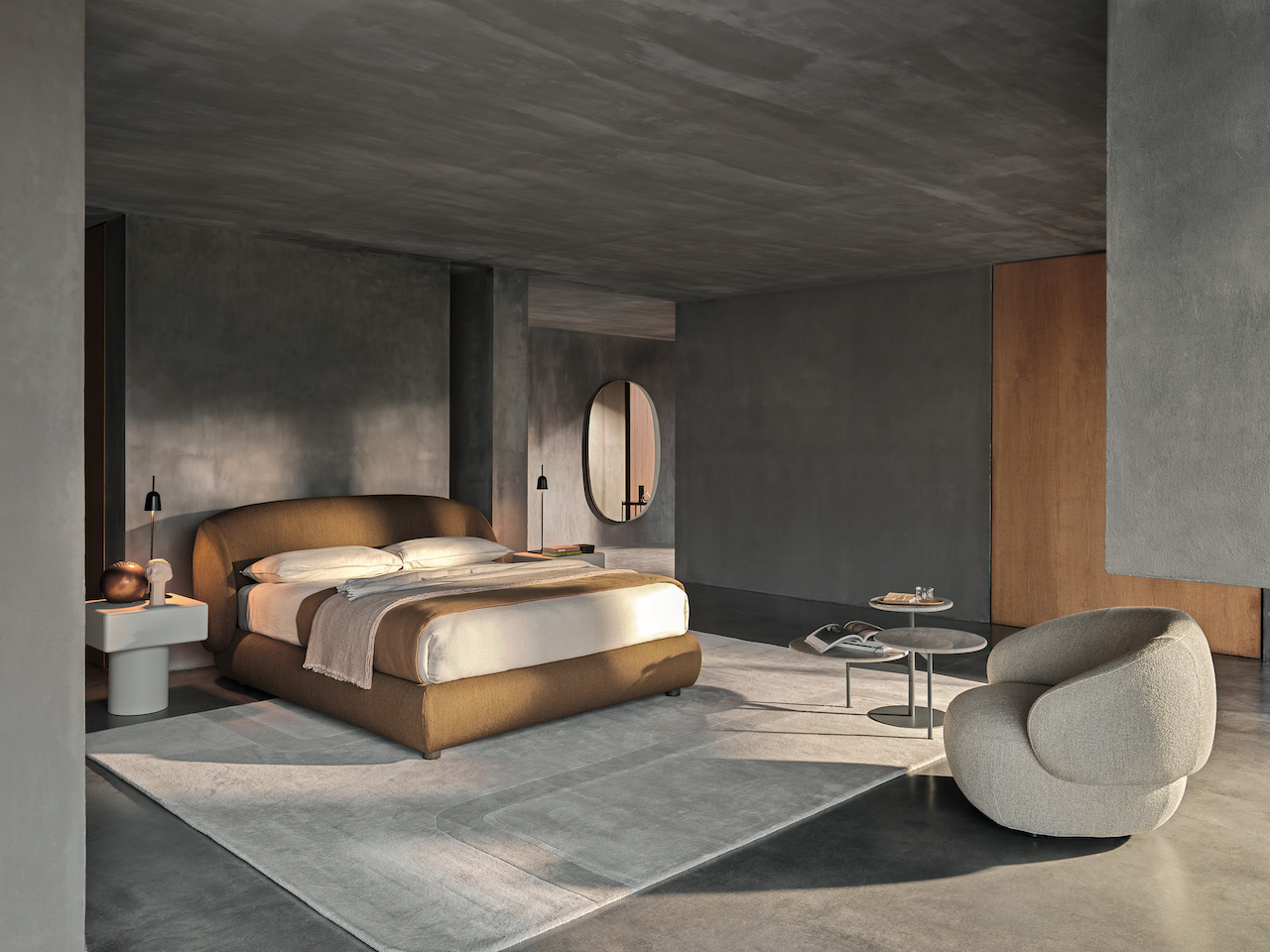 A generous curve defines the headboard of a sculptural bed distinguished by soft shapes. Providing both comfort and intimacy, Pacific outlines a welcoming place to rest and feel cocooned. The bed extends and completes the namesake collection comprising a sofa and armchair.